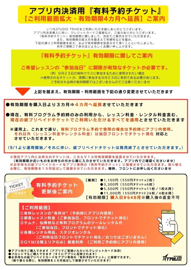 いつもSTUDIO TRIVEをご利用いただき誠にありがとうございます。アプリ内でご利用いただく『有料予約チケット』について、有効期限延長および利用範囲を拡大させて頂くことといたしました。下記ご案内をご参照くださいませ。度々の運用変更となり申し訳ございません。