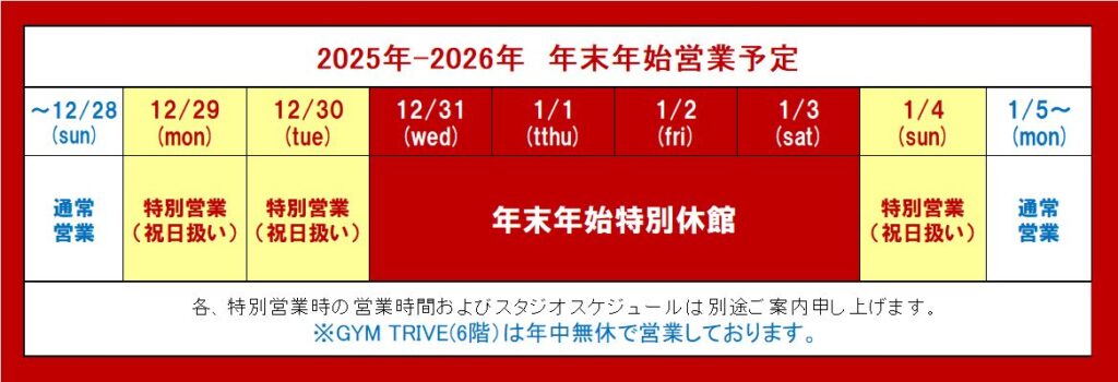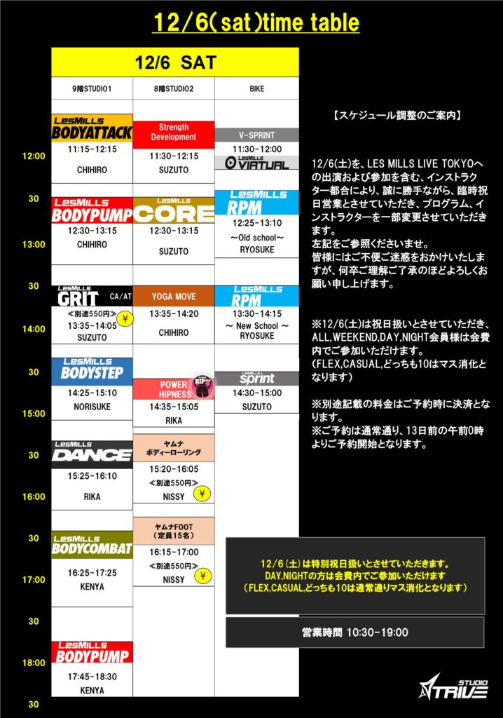 ※12/6(土)を、LES MILLS LIVE TOKYOへの出演および参加を含む、インストラクター都合により、誠に勝手ながら、臨時祝日営業とさせていただき、プログラム、インストラクターを一部変更させていただきます。別途12/6(土)スケジュール表をご参照くださいませ