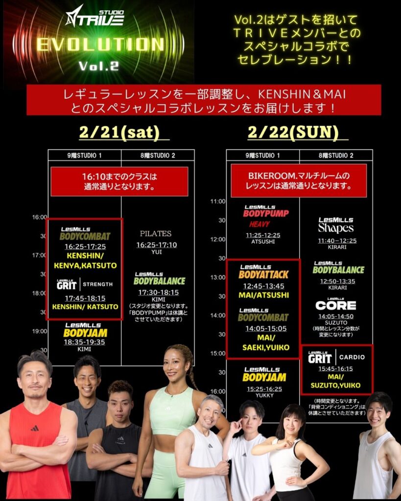 第2弾は、ゲストを招いてTRIVEでセレブレーション!TRIVEメンバーとのスペシャルコラボもお楽しみください!2/21(土)22(日)は通常のレギュラーレッスンを一部調整させていただきます。予めご了承くださいませ。