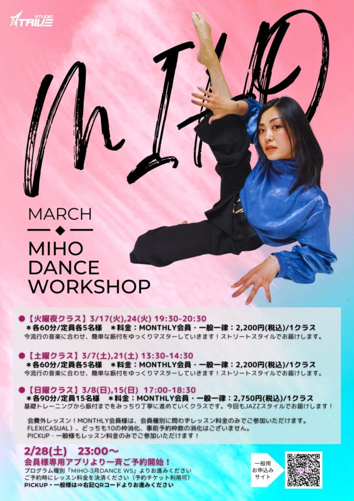 いつもSTUDIO TRIVEをご利用いただき誠にありがとうございます。好評いただいております、MIHOによるDANCE-WORK SHOP3月のご案内でございます。