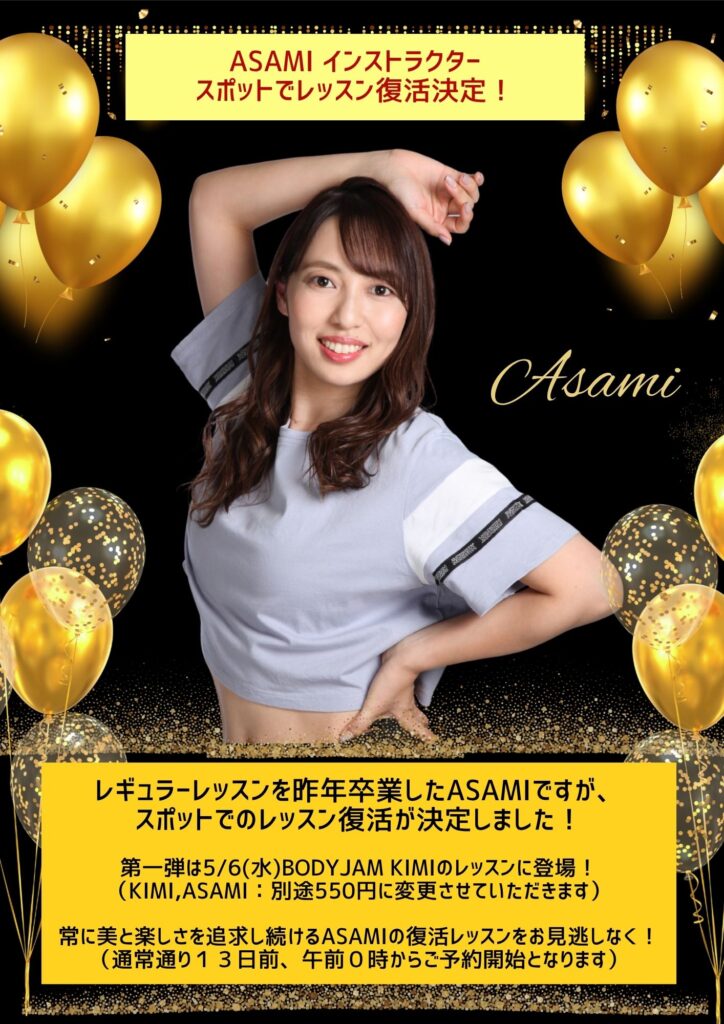 いつもSTUDIOTRIVEをご利用いただきありがとうございます。ゴールデンウィークの5/6(水)BODYJAM KIMIのクラスに、昨年レギュラーレッスンを卒業したASAMIがスポット復活で参戦することが決定しました!詳細は改めてゴールデンウィークスケジュールをご参照くださいませ。